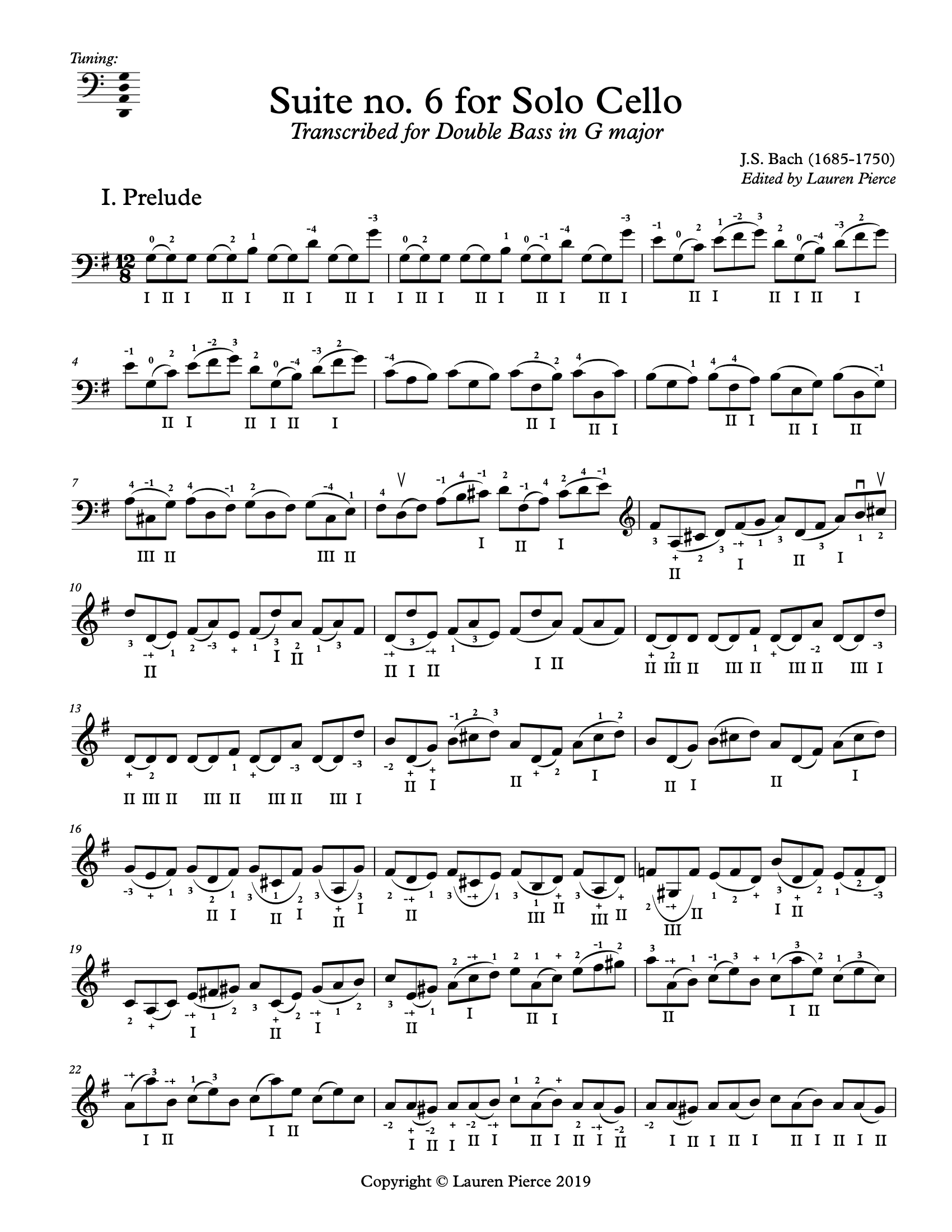 My personal edition of Bach's Cello Suite No. 6, arranged for double bass and transposed into G Major. All movements are included.