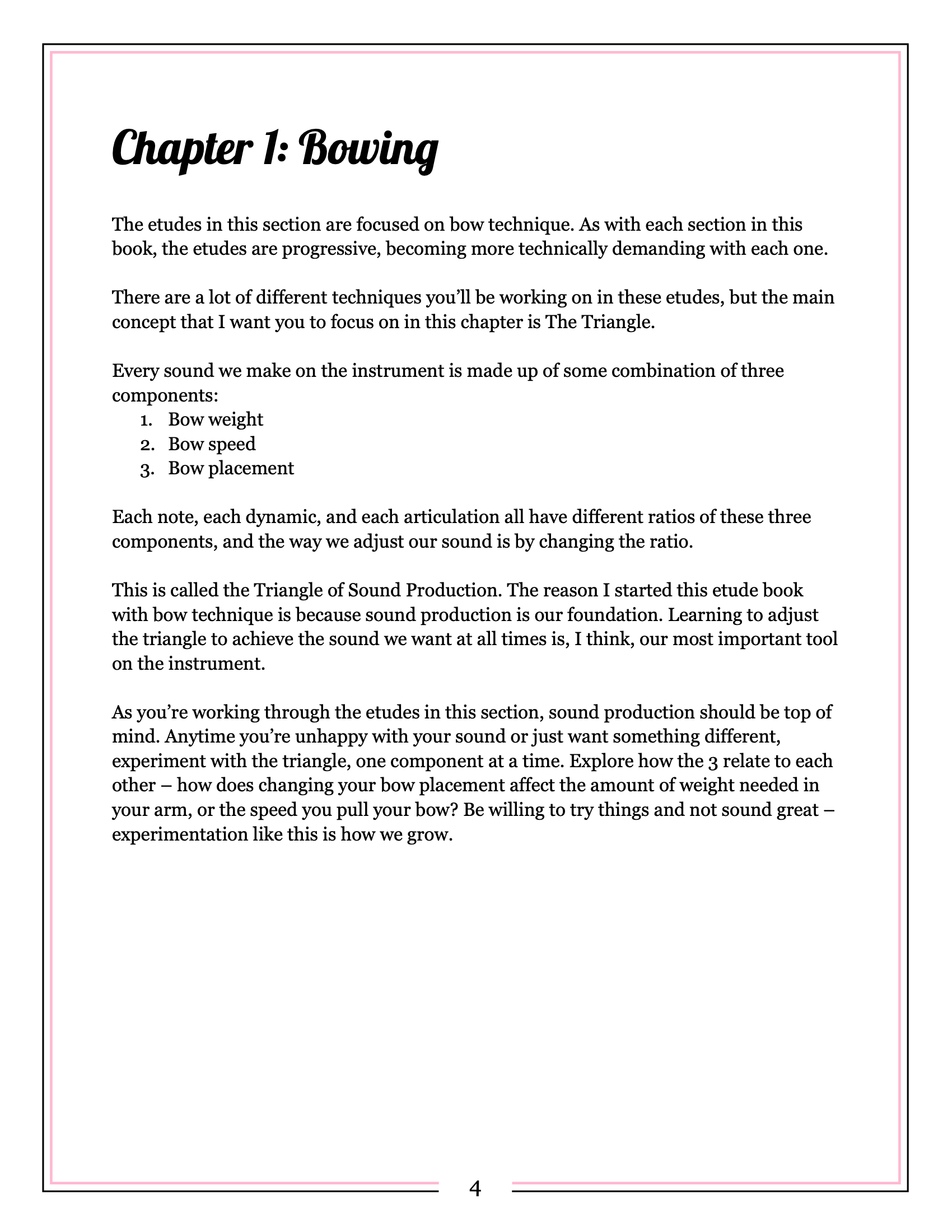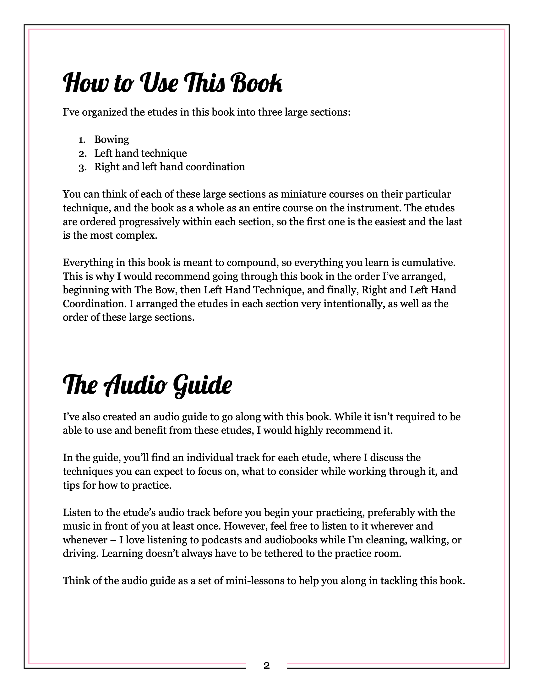 Everything in this book is meant to compound, so everything you learn is cumulative. This is why I recommend going through this book in the order I’ve arranged, beginning with The Bow, then Left-Hand Technique, and finally, Right and Left-Hand Coordination. I arranged the etudes in each section very intentionally, as well as the order of these large sections.